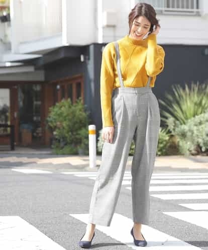 ◆注目のチェック柄パンツ◆人気のカラートライン入りグレンチェックを使ったきれいめワイドパンツ。シンプルデザインがニット合わせに万能です。サスペンダーは取り外し可能。