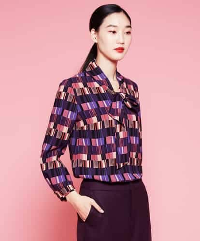 程よい落ち感と上品な光沢感のあるバックサテン地に、バランスのとれた配色感のあるブロックプリントを施したブラウス。ボトムスを選ばずスタイリングを組みやすいボウタイのブラウスは、シーズンレスで着やすいトップスです。同素材のドレス 【GBEAG13590】もおすすめです。model:H173 B82 W59 H89