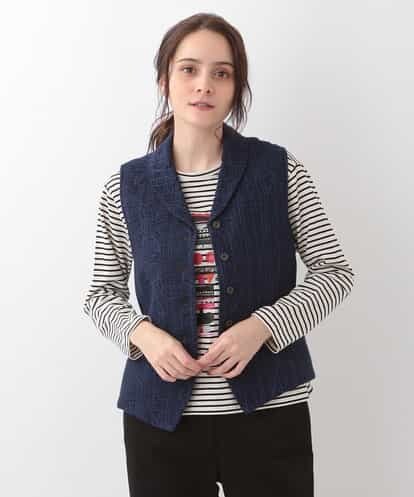 風合いのあるコットンダブルガーゼで仕立てたジレです。コットンガーゼの柔らかな質感に、シャーリングステッチで描いた柄が立体感のある表情を魅せてくれる一着です。モードなショールカラーに、ウッド調のデザインボタンやさりげないストライプ柄の裏地もアクセントに。同じテキスタイルで仕立てた【NGDJD30330】もお薦めです。※裏地付きmodel:H165 B79 W60 H88 着用サイズ:M
