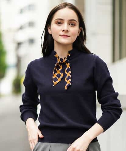 幾何学柄のスカーフがアクセントに映える、モダンレディなニットプルオーバー。 やや詰まったネックラインがよりきちんと感を演出してくれます。 ベースのニットはシンプルな無地なので、デイリーカジュアルからオフィススタイルにと幅広いシーンに活躍してくれます。 model:H165 B79 W60 H88 着用サイズ:M