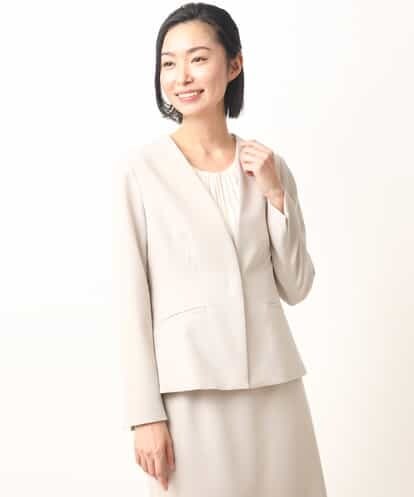 ■セレモニーおすすめアイテム■ブラックフォーマルにも使われる「NOIE」の糸を使用。安定した濃い黒色が出せる特徴があります。ストレッチも効いてしわにもなりにくい素材をすっきりとしたシンプルなノーカラージャケットに仕上げました。通勤にはもちろんセレモニー等にも幅広く使える便利なジャケットです。同素材スカート▼FMHDG02170※屋外での撮影は色味が多少異なる場合がございます。商品の色味は、スタジオ撮影の画像をご参照ください。