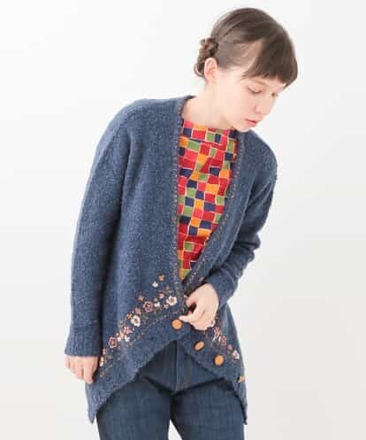 ネックからフロントにかけて施したポップなフラワー刺繍が魅力のイレギュラーヘムカーディガン。ほっこりとした可愛らしいデザインがjocomomolaらしく、防寒の役割だけでなく、スタイリングの主役にしたくなる一着です。プードルニットのようなふわりとした着心地の良い風合いが着回し間違いなしのカーディガンです。上下逆さまに着用も可能で、ボタンの掛け方によっても雰囲気が変わるので、合わせるインナーや着用シーンによって様々な着方が叶います☆model:H167 B80 W58 H87 着用サイズ:M