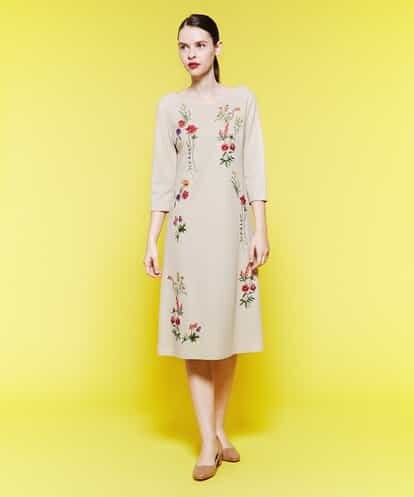 アッシュクウールのベースに丁寧に花々の刺繍を施したドレス。滑らかなアッシュクウールはナチュラルなストレッチ性と通気性を兼ね合わせた最高品質。花々は1本1本繊細に色を組み合わせて施し、色鮮やかに表現しています。ベーシックカラーにワンポイントの花刺繍が華やかさを演出するアイテムです。※アンダードレス付きmodel:H170 B80 W58 H81 着用サイズ:M