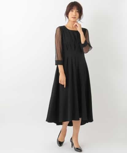 ドット柄を施したチュールをスリーブにドッキングしたワンピースドレスです。腕のスケ感を演出するチュールはさりげない肌見せ感で大人シックな装いにまとめてくれます。ハイウエストにタックを寄せ、ウエストを絞ったスタイルアップが叶う一品。パーディーシーンにもさりげない存在感を発揮してくれる、特別なシーンに合わせたいワンピースです。※バックファスナー、裏地付き。model:H167 B80 W59 H84 着用サイズ:M