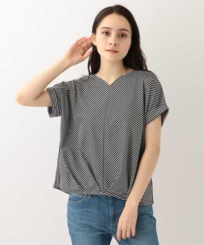 ◆1枚でサマになるハートネックのカットソー◆さらりとした生地が夏に着やすいデイリーなブラウス見えトップスです。フロントをストライプがバイヤス柄(斜めに柄)になるよう生地を使い、着やせ効果も!?お腹周りをカバーする裾タックデザイン。爽やかなサックスとブルーの色展開。デコルテを美しく見せてくれるハートネックがポイント。※34(XSサイズ)・42(XLサイズ)はWEB・一部限定店舗での販売です。