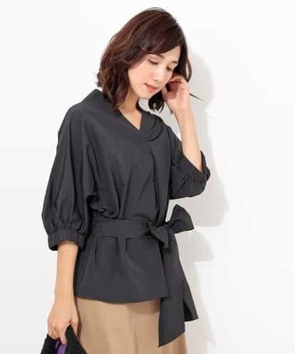 袖にボリュームを持たせた抜け感ブラウス。セットのリボンでウエストマークしてぺプラム風ブラウスとしても、リボンなしでウエストインしてすっきりとした着こなしでも楽しめる1枚。抜き衿風の着こなしがおすすめ。綿とポリエステル糸を使ったナチュラル感のあるシャツ素材。吸湿性がありながらシワになりにくいケアが簡単な素材です。